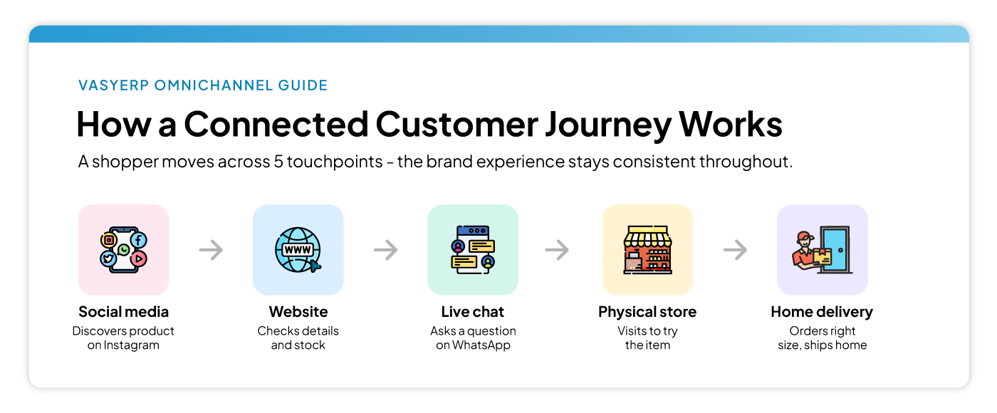 In an omnichannel setup, the customer experiences a unified brand. The channel may change, but the journey stays connected.